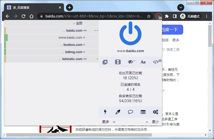 安装完成后,启用此插件即可,插件内置上千条过滤规则,无需手动额外添加过滤规则。此插件默认是对所有网站启用广告拦截,如果不想拦截某网站的广告(加入白名单),先打开某网站,在Chrome浏览器右上角找到uBolck Origin的图标按钮,点击“开关”图标按钮即可,再点击就是对当前网站启用广告拦截。
