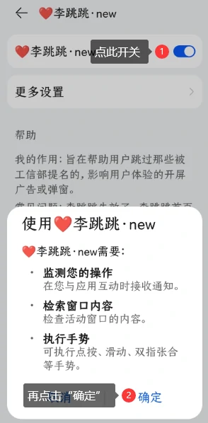 以华为手机鸿蒙系统3.0为例。四、在列表找到“李跳跳”,点击开关会弹出确认开关的提示,点击“确定”,然后返回到李跳跳APP或者返回桌面即可,可打开几个有启动页广告的安卓应用测试是否会自动跳过广告。