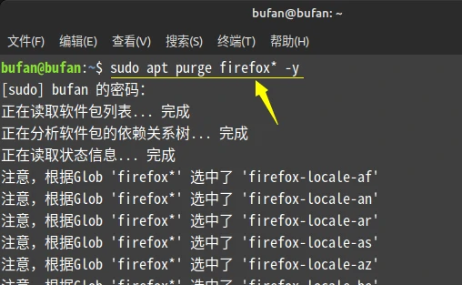 按Ctrl + Alt + T键打开终端,输入命令执行彻底卸载与Firefox火狐浏览器相关的包:sudo apt purge firefox* -y