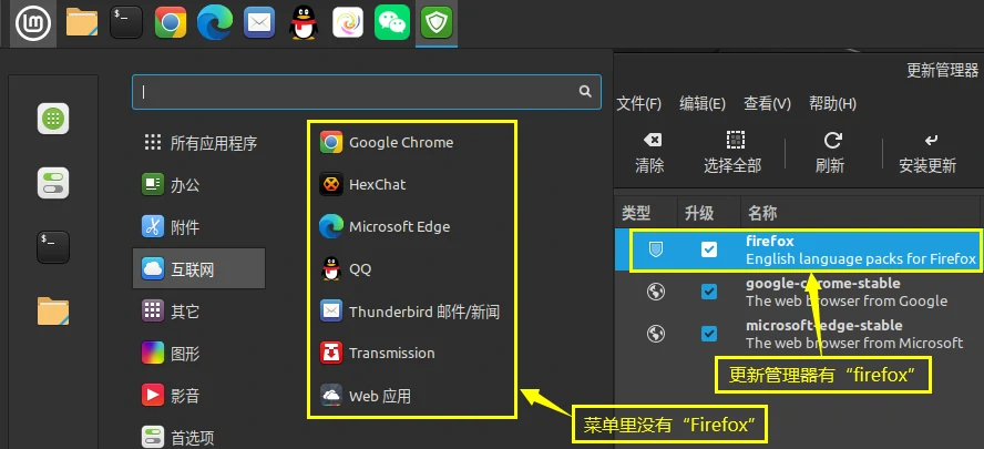 Ubuntu桌面系统和基于Ubuntu开发的桌面系统(例如LinuxMint),预装的网页浏览器基本都是Firefox火狐浏览器,通过软件商店卸载Firefox火狐浏览器,虽然卸载完成了,但是Firefox火狐浏览器还有其它的包在系统内并没有完全卸载干净。 例如LinuxMint系统,通过软件管理器卸载Firefox浏览器,“更新管理器”的列表中还有firefox的更新项目,见下图。