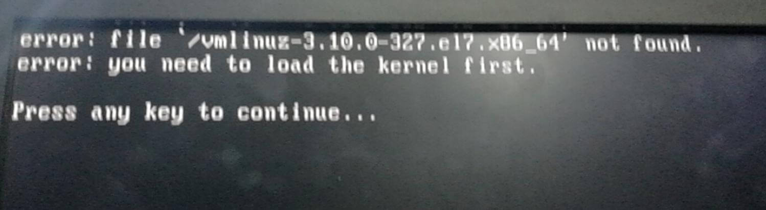认真分析一下,提示信息是说找不到”3.10.0-327.el7.x86_64“版本的内核,那既然如此,百度(google)吧!关键词”centos 7 内核升级重启找不到内核“ ,找到一下几篇文章: