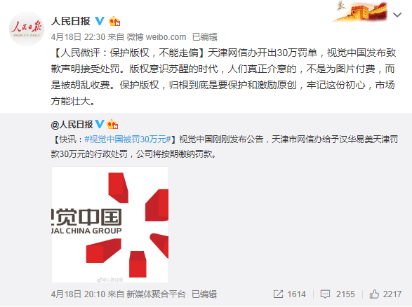 据人民日报官方微博18日晚消息,视觉中国刚刚发布公告,天津市网信办给予汉华易美天津罚款30万元的行政处罚,公司将按期缴纳罚款。对此,人民日报官方微博评论:天津网信办开出30万罚单,视觉中国发布致歉声明接受处罚。版权意识苏醒的时代,人们真正介意的,不是为图片付费,而是被胡乱收费。保护版权,归根到底是要保护和激励原创,牢记这份初心,市场方能壮大。