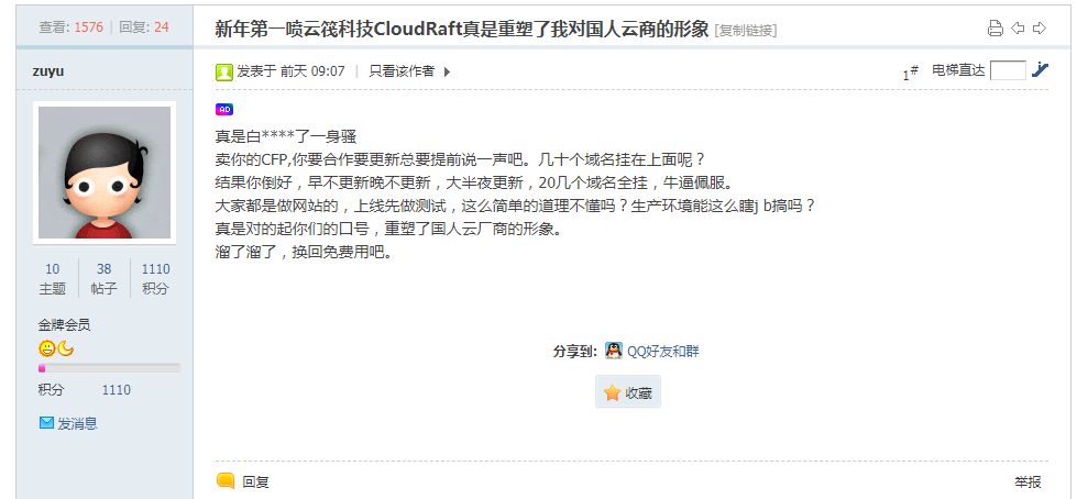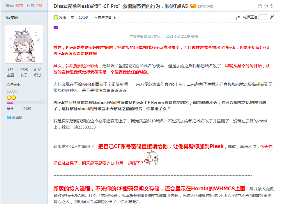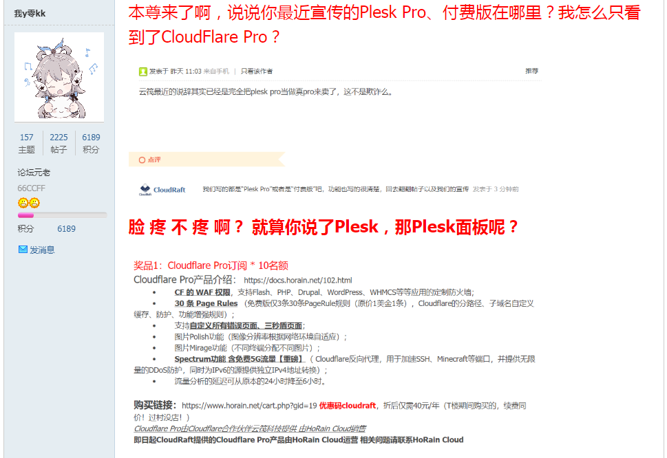 首先我想说的是云筏其实确实是国人商家中非常不错的了,毕竟靠的各位的喜爱,用爱发电,所以,你还要什么自行车?比起美杜莎云王老板来说,老板人还是挺不错的,虽然美中不足的是工单付费,但...确实老板不可能整天守着网站后台等着处理工单,你这么低的价格买到这么好配置的服务器和"CloudFlare Pro" 已经非常不错了,所以还要什么免费处理工单呢。还有就是你们买的"CloudFlare Pro"域名被删除的问题,这不就是云筏老板对接horain时出现了问题导致的,而且也发公告澄清了,也出了解决方案,自行前往horain注册账号发工单提交下cloudflare的账号密码,这不非常人性化吗?(而且大家买云筏的机器不就是玩玩吗?谁他*还真的用于生产环境搞生产放站点吧?不会吧不会吧?你他*不怕数据没了吗?)并且 感谢您的理解与支持!对于你们的理解老板也第一时间了解到。希望某些LOC的MJJ们好自为之,不要做些不太理智的行为,尤其是上面截图中的两位。有问题第一时间在售后群里沟通,而不是在论坛瞎起哄。最后讲一句,谁买oneman谁就是活该数据丢失,活该被反撸。阿里云、腾讯云我们都是嘴上说垃圾,其实背地里活动搞了好几套,毕竟有工单处理+24小时热线。